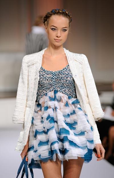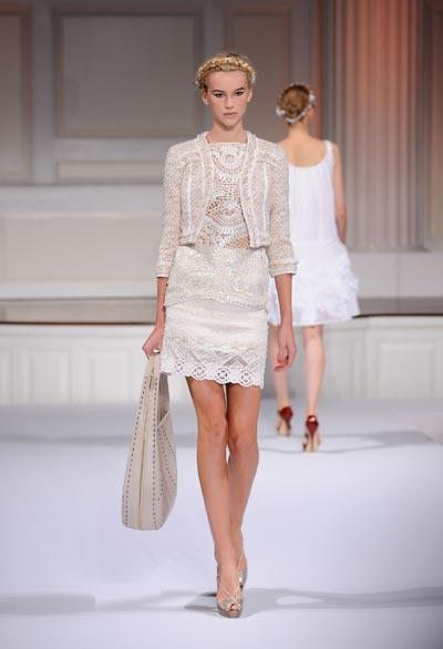 Combinó un abrigo verde azulado con bordados en limón con un vestido de encaje blanco, cubrió un vestido sin tirantes con lentejuelas de bronce y otro traje con una pretina bordada de piedras turquesa y coral. Decoró con dorado los hombros de una blusa crema, que hizo juego con una falda recta y accesorios también dorados. Chaquetas de safari con pantalones ajustados de seda, y un par de pantalones estilo gaucho de lino con una blusa blanca de algodón y chaqueta bronce.